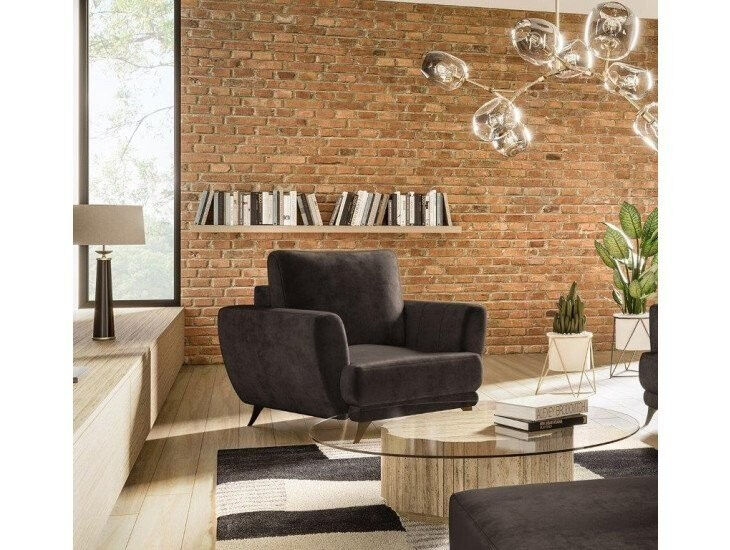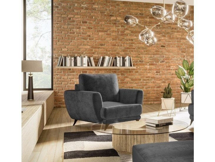 Fotelj MIKI je kombinacija udobja in preprostosti, podprta s sodobnim pridihom. Miki ima brezčasen dizajn in visoke naslone za roke z nežnimi šivi. Sedežna blazina je polnjena z visoko prožno HR peno, ki zagotavlja dobro oporo telesu. Fotelj je vzmeten z valovitimi vzmetmi. Ima 13 – cm visoke noge, ki so izdelane iz črne kovine.