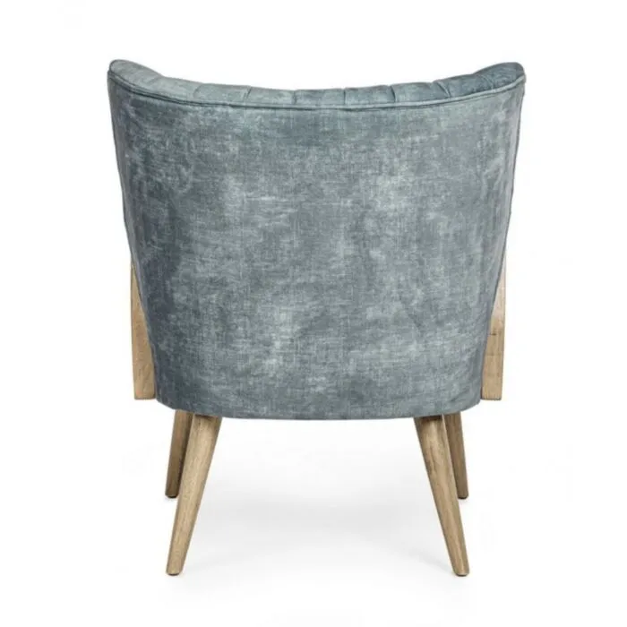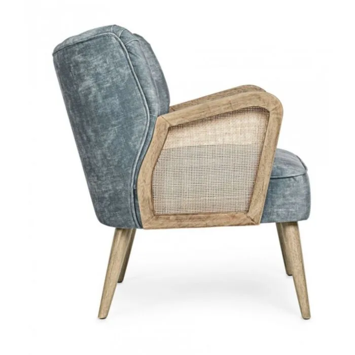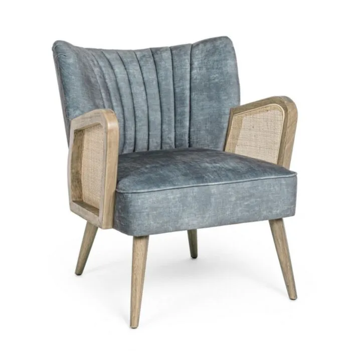 Fotelj VIRNA modra ima žametni učinek. Okvir je iz borovega lesa in polnjen je z peno. Naslonjala za roke so z vložki iz ratana in prevleka je iz poliestra.