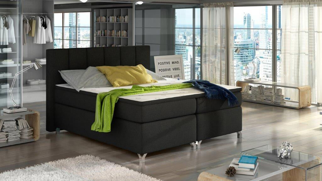 Francoska postelja BAS je oblečena v visoko kakovostno tkanino. Čvrsta vzmetnica je nameščena na robustnem oblazinjenem okvirju, s prostorom za shranjevanje posteljnine. 20 cm debelo spodnje ležišče sestavlja Bonell vzmetenje in visoko elastična pena.