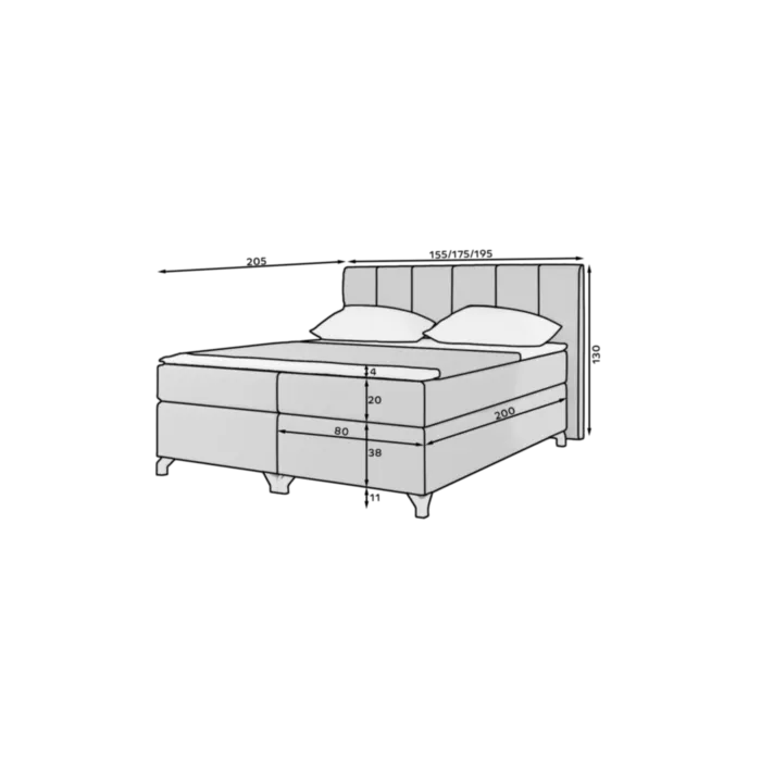 Francoska postelja BAS je oblečena v visoko kakovostno tkanino. Čvrsta vzmetnica je nameščena na robustnem oblazinjenem okvirju, s prostorom za shranjevanje posteljnine. 20 cm debelo spodnje ležišče sestavlja Bonell vzmetenje in visoko elastična pena.