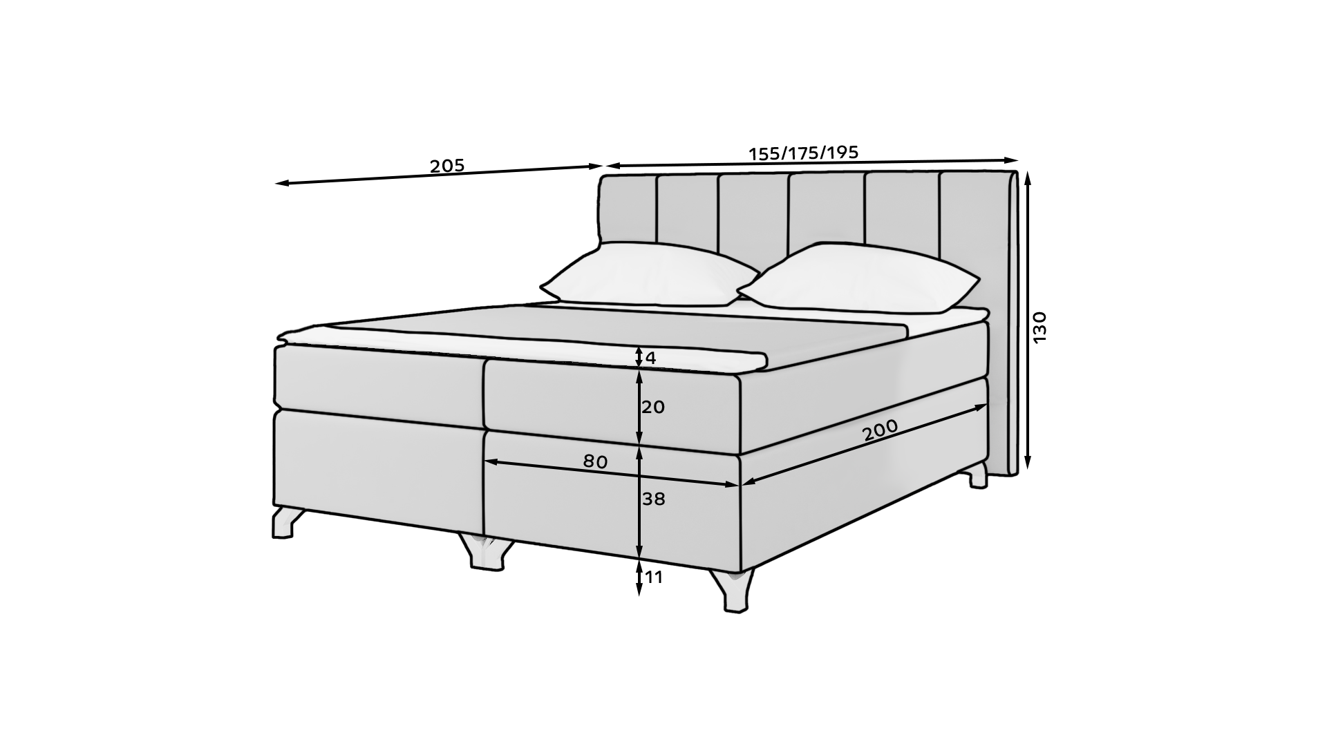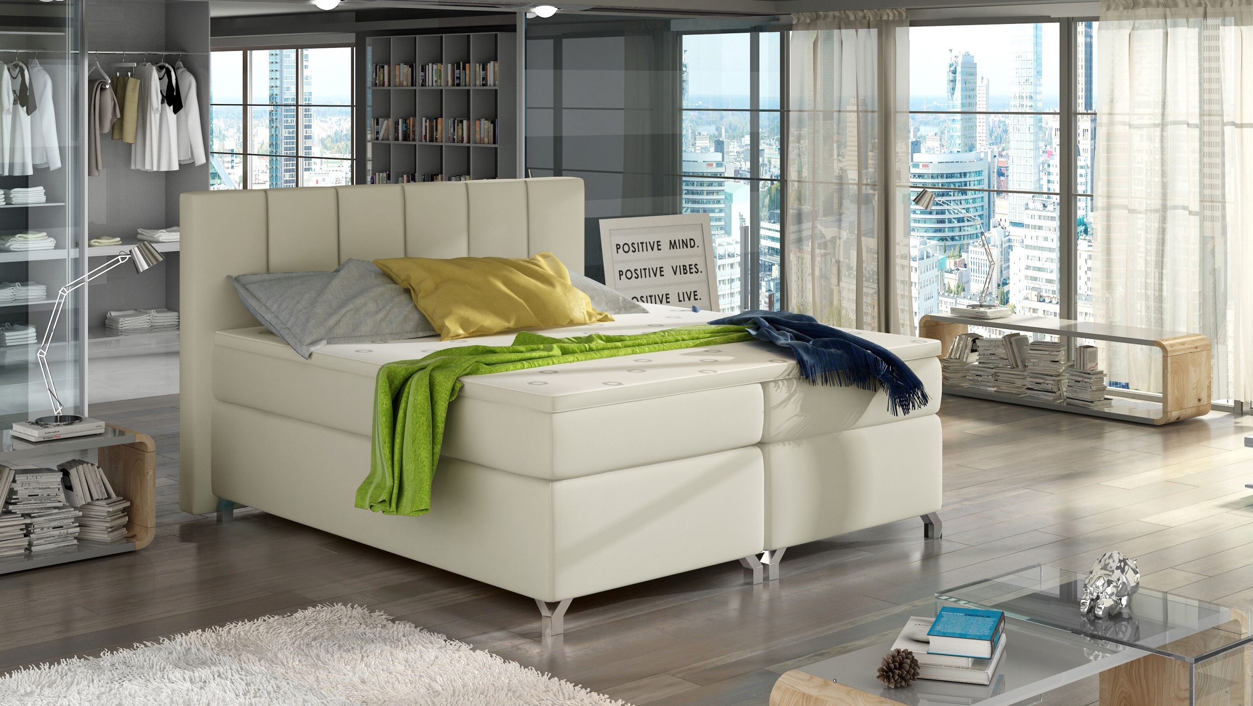 Francoska postelja BAS je oblečena v umetno usnje. Čvrsta vzmetnica je nameščena na robustnem oblazinjenem okvirju, s prostorom za shranjevanje posteljnine. 20 cm debelo spodnje ležišče sestavlja Bonell vzmetenje in visoko elastična pena.