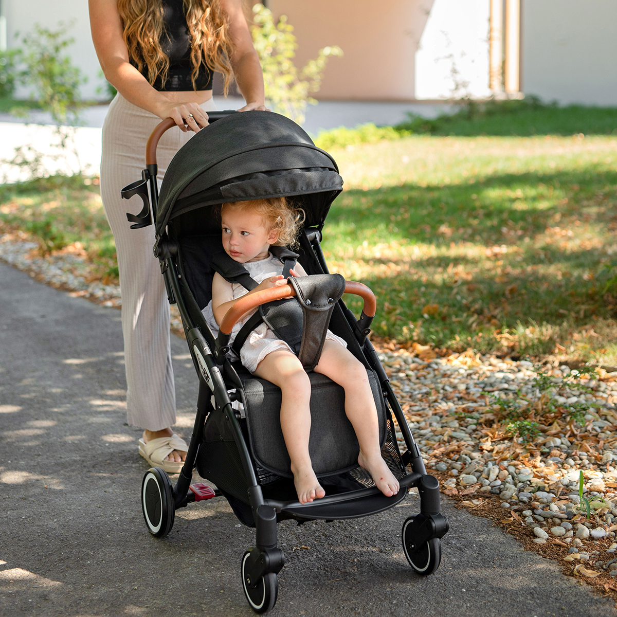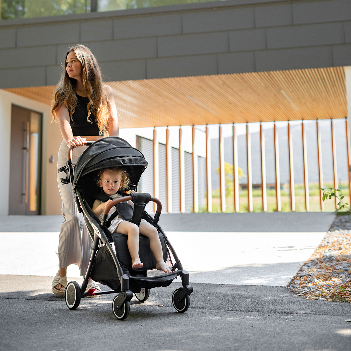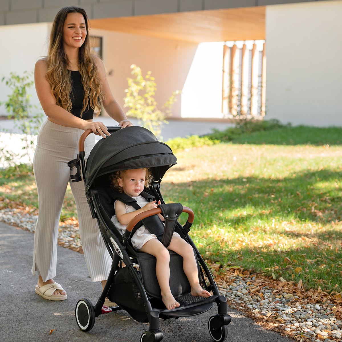 Odlikujejo ga kompaktno anodizirano aluminijasto ogrodje, ki se samodejno zloži s pritiskom na gumb ter vzdržljiva PU kolesa, ki dobro blažijo tresljaje in so primerna za različne podlage. Voziček je primeren za različne vremenske razmere, saj podaljšana strehica otroka zaščiti pred soncem in vetrom. Praktičnost uporabe in udobje otroka zagotavljajo odstranljivo sprednje varovalo oblečeno v eko usnje ter ročaj z eko usnjem, nastavljiv hrbtni naslon ter priloženo držalo za stekleničko in priročna torba z ročajem/ramenskim trakom za shranjevanje in prenašanje vozička.