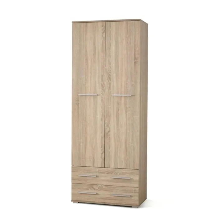 Garderobna omara ALMA 2 je zelo stabilna in kvalitetna. Primerna je za vsak prostor. Omara je narejena iz laminirane plošče z ABS robovi. Korpus je v barvi hrast sonoma/ fronte pa so v beli barvi visoki sijaj in v barvi hrast sonoma visoki sijaj.
