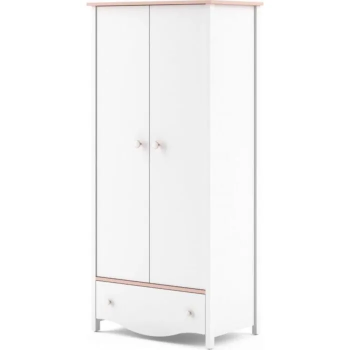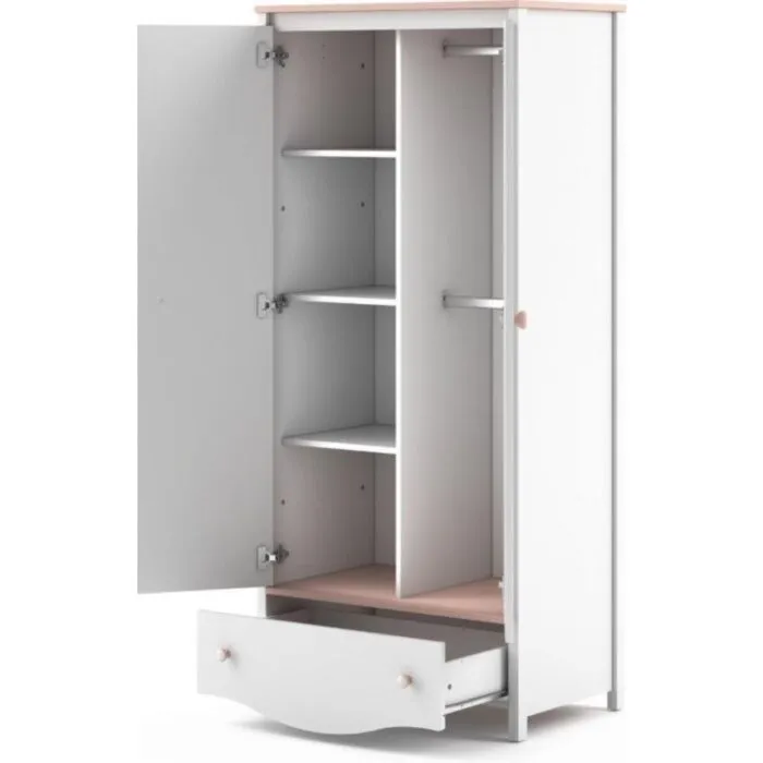 Garderobna omara BELLA je sanjska omara za vsako dekliško spalnico. Dvokrilna omara s policami, predalom ter prostorm za obesit obleke. Ima nežno nevtralno roza belo barvo, ki se sklada v vsak prostor.