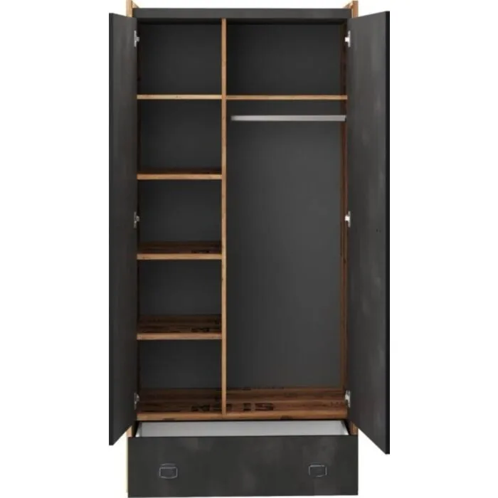 Garderobna omara FERGO 2 je primerna za vsako spalnico. Njene moderne linije in brezčasen dizajn, vas bodo navdušli. Ima dvojna vrata ter en predal. Vsebuje tudi 6 polic.