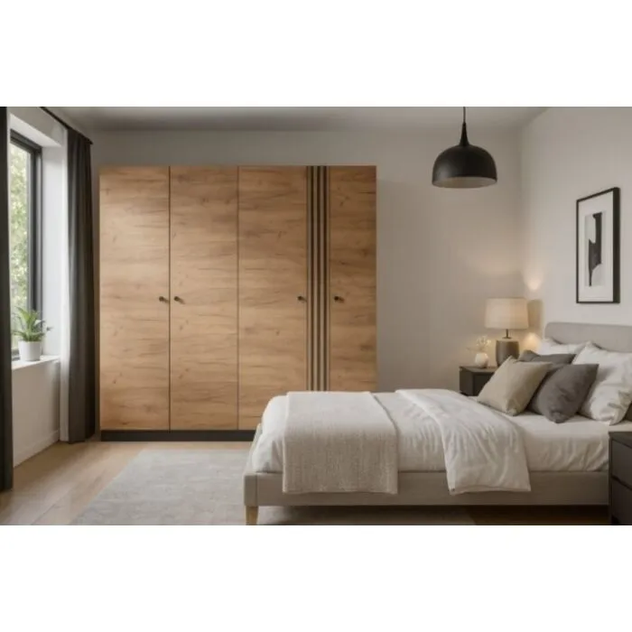 Garderobna omara GALIJA vas bo očarala s svojimi toplimi barvami skandinavskega hrasta v kombinaciji s kontrastno antracit barvo, ki bodo vašo spalnico naredile prostor blizu narave. Garderobna omara GALIJA je narejena iz kvalitetne laminirane plošče z ABS robovi ter ima črno/zlate ročaje.
