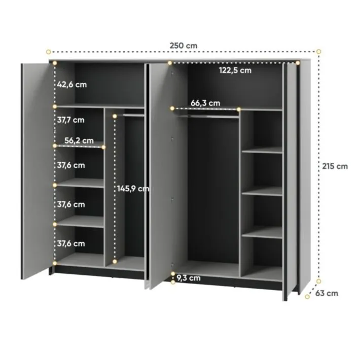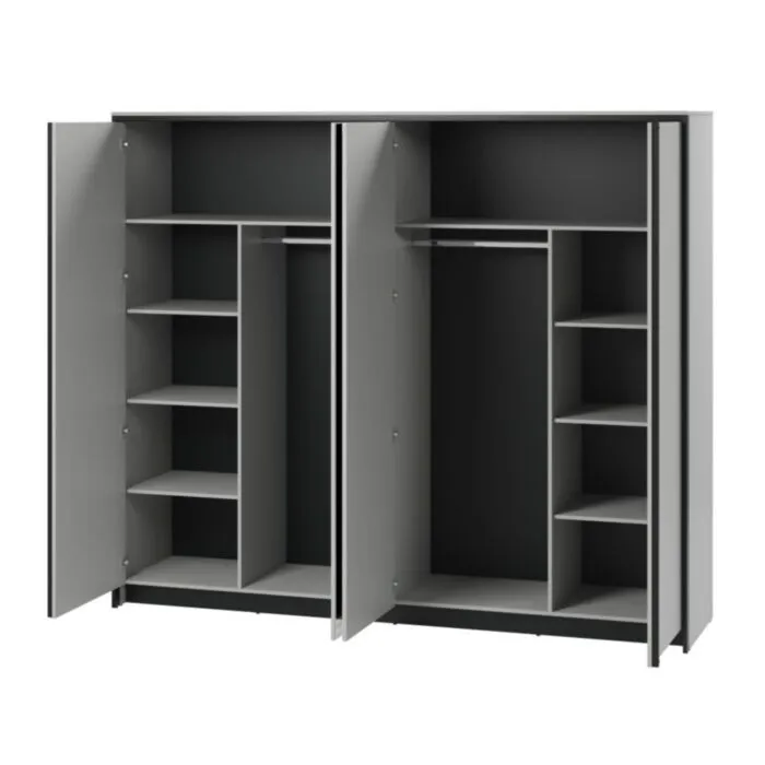 Garderobna omara GRIZLI je kakovosten kos pohištva. Združuje dve lastnosti in sicer: funkcionalnost in privlačen dizajn. Omogoča shranjevanje oblačil, obutev in drugih predmetov hkrati pa ohranja eleganten in klasičen videz. Omara GRIZLI je opremljena z LED osvetlitvijo, ki še dodatno poveča njeno praktičnost in vizualno privlačnost.