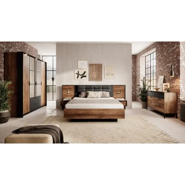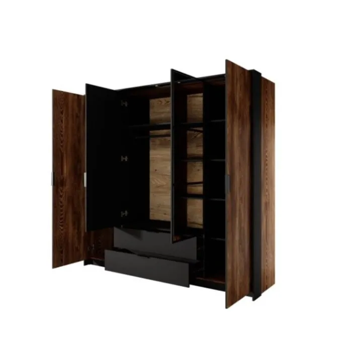 Garderobna omara HILTON je izvirna in stilska. Vsebuje harmonijo čudovitih dekorjev barv: antracit in kostanj. Garderobna omara je opremljena z ogledali, praktičnimi predali in LED osvetlitvijo. Izdelana je iz kvalitetne laminirane plošče z ABS robovi. Vsebuje črne kovinske ročaje.