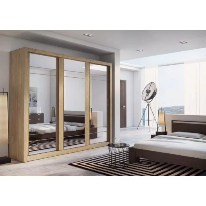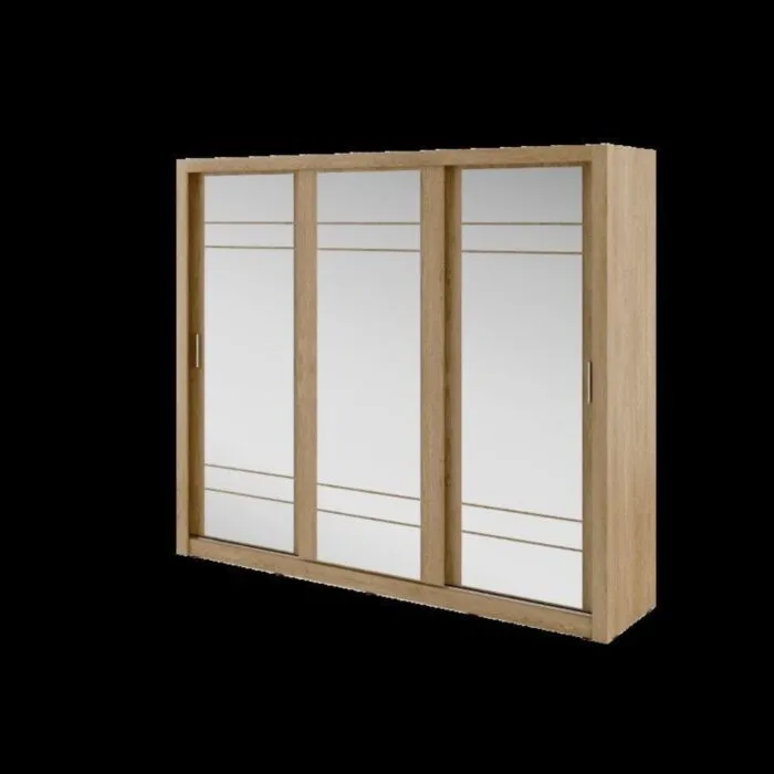 Garderobna omara KALIJA s tremi drsnimi vrati in ogledali. Omara vsebuje obešalni del kakor tudi police. Izdelana je iz laminirane plošče z ABS robovi. Garderobna omara je v barvi hrasta.