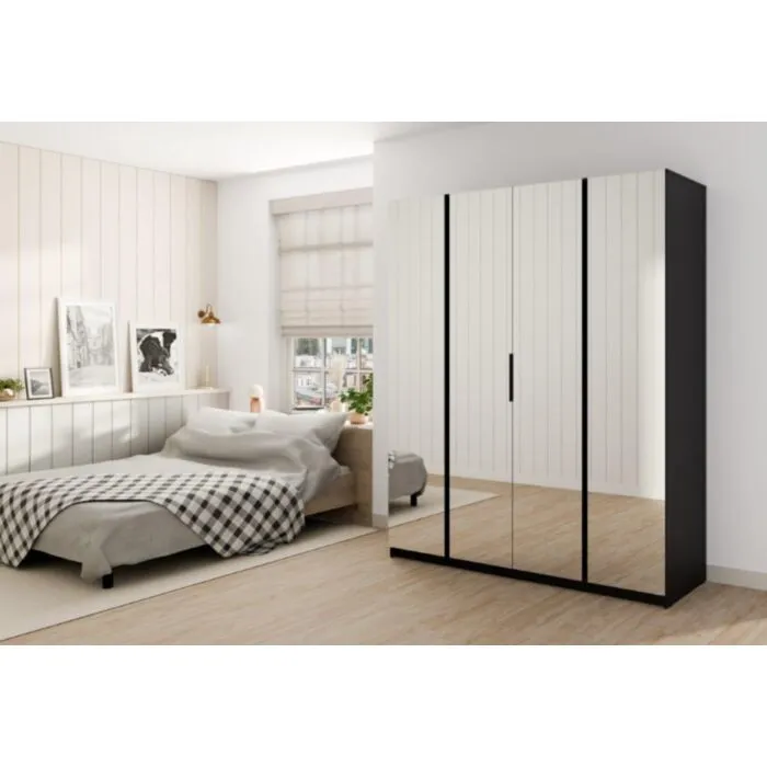 Garderobna omara KALINA 2 200 cm ima moderen dizajn. Narejena je iz laminirane plošče debeline 16 mm. Stranice so v črni barvi, na vseh frontah pa je ogledalo.