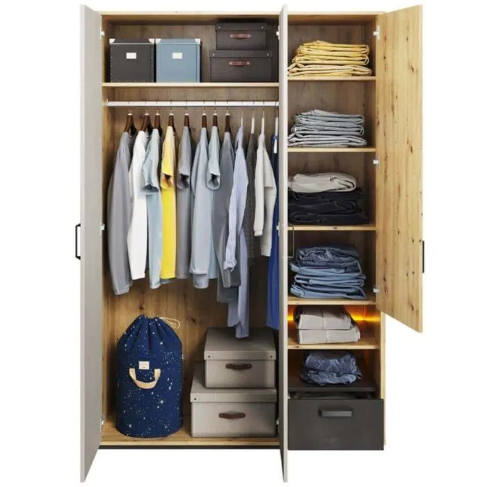 Garderobna omara KINDER je trivratna omara s palico, omaro s policami, predalom, dvema vdolbinama ter LED osvetlitvijo. Omaro odlikuje tudi zanimiva zasnova – geometrična oblika, fronte vrat in predali vstavljeni pod korpus ter trije barvni dekorji – siva, les in surovo jeklo ustvarjajo edinstveni izgled. Sodoben značaj ohišja dodatno poudarjajo oblikovani kovinski ročaji in nizki nosilci. V kompletu je LED osvetlitev.
