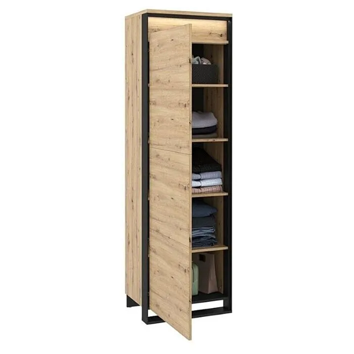 Dvokrilna garderobna omara KVIN 2 je prostorna omara s palico za obešalnike in notranjo knjižno omaro s policami. Omara je prostorna in moderna, zlije se v vsak prostor in mu doda občutek modernosti s pridihom elegance. Ima tudi LED lučke za dodaten prefinjen izgled. S mehanizmom “push to open” se vrata odpirajo počasi ter varno.
