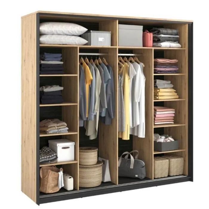 Garderobna omara KVIN 4 je modna omara z dvojnimi drsnimi vrati. Opremljena je z velikim ogledalom ter funkcionalno razporeditvijo polic in palic. V svoji notranjosti skriva dve palici za obešalnike, na katere lahko obesite oblačila različnih dolžin in prostorne police. Ima vključeno LED osvetlitev.