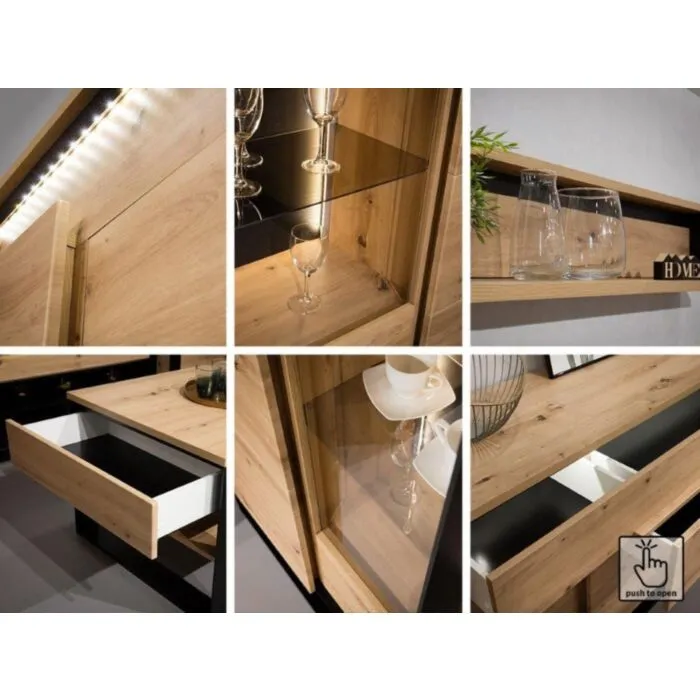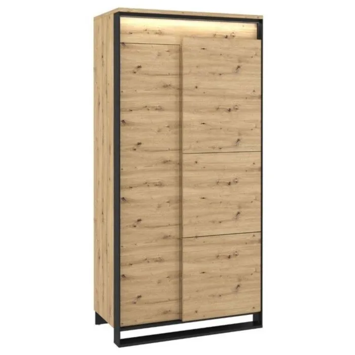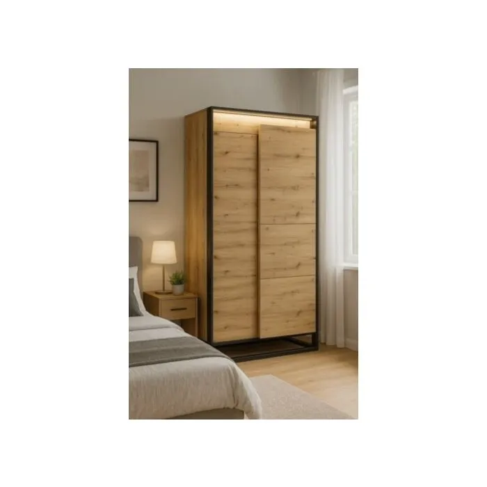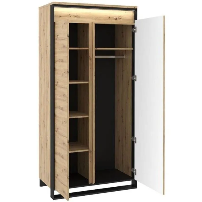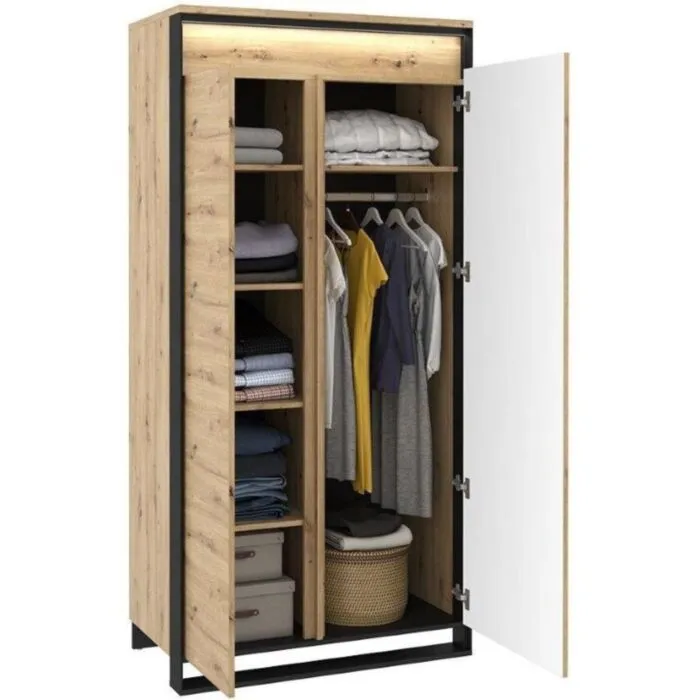 Dvokrilna garderobna omara KVIN je prostorna omara s palico za obešalnike in notranjo knjižno omaro s policami. Omara je prostorna in moderna, zlije se v vsak prostor in mu doda občutek modernosti s pridihom elegance. Ima tudi LED lučke za dodaten prefinjen izgled. S mehanizmom “push to open” se vrata odpirajo počasi ter varno.