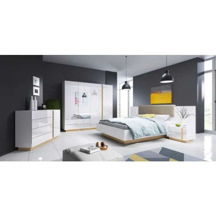 Elegantna in moderna garderobna omara NANCY je narejena iz odličnih materialov v bela visoki sijaj/hrast dekorju. Omara NANCY bo vaši spalnici dala sodoben in eleganten videz. Vse to zahvaljujoč sijočim belim frontam, ki jih prekinja kontrastni hrastov poudarek. Minimalistične oblike bodo našle svoje mesto v vsakem prostoru. Garderobna omara je opremljena z dvema prostornima predalnikama, katera omogočata priročno shranjevanje različnih oblačil in dodatkov. Številne police ponujajo veliko prostora za organizacijo. V notranjosti je tudi obešalnik ter prostor za obešanje vaših oblačil in najljubših kosov.
