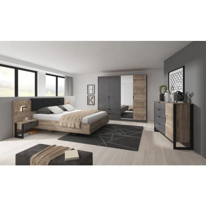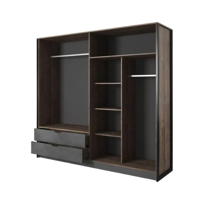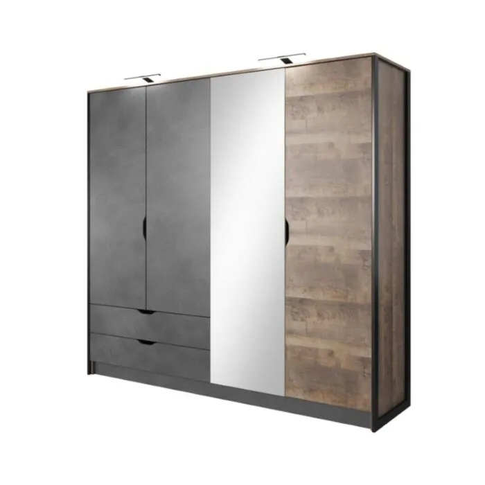 Elegantna in moderna garderobna omara NEDA je narejena iz odličnih materialov v antik sivem/hrast dekorju. Kombinacija hrastovih desk in temno sive kovine, skupaj z naravnimi črnimi okvirji bo vaši notranjosti dala edinstven občutek elegance. Omara ima ABS robove, ki zagotavljajo večjo odpornost proti udarcem, vlagi in obrabi ter podaljšujejo njeno življenjsko dobo. ABS robovi ne le ščitijo pred poškodbami, ampak poskrbijo tudi za lepši in elegantnejši videz pohištva.