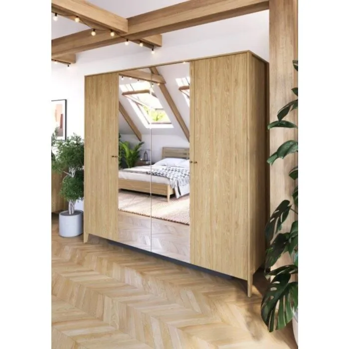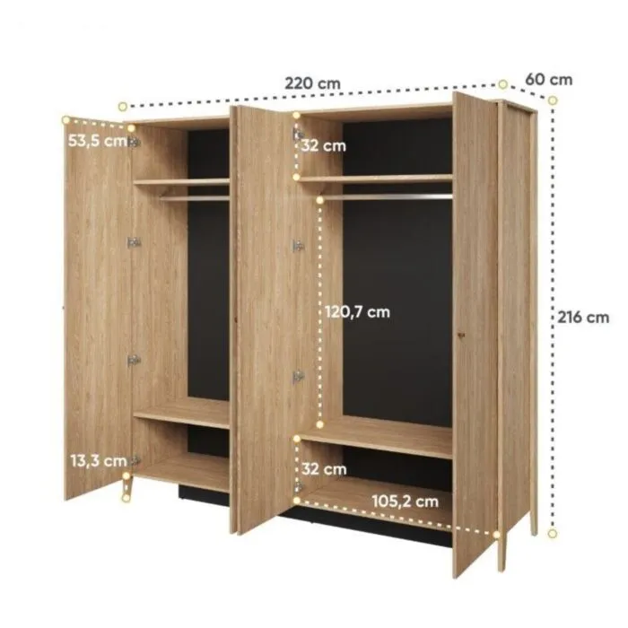 Garderobna omara NOLE je narejena iz laminirane iverne plošče debeline 16mm. Omara je iz oljenega hrasta in vsebuje tudi ogledalo. Hrbtna stran omare je iz HDF plošče 3mm, v črni barvi. Ročaji so kovinski ter vsebuje mehko zapiranje.