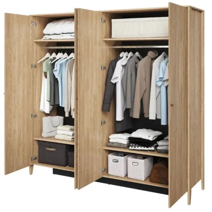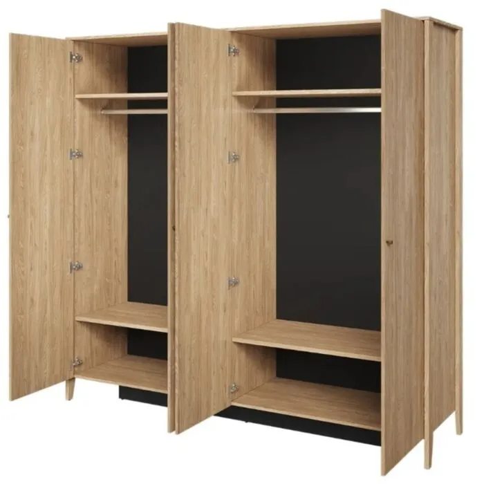 Garderobna omara NOLE je narejena iz laminirane iverne plošče debeline 16mm. Omara je iz oljenega hrasta in vsebuje tudi ogledalo. Hrbtna stran omare je iz HDF plošče 3 mm, v črni barvi. Ročaji so kovinski ter vsebuje mehko zapiranje.
