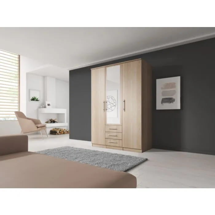 Garderobna omara SARA je trokrilna omara. Je zelo prostorna in praktična. V desni in levi omari je ena polica in palica za obešalnike, medtem ko v sredinski omari so poličke. Omara ima tudi tri predalnike. Dobavljiva je v beli barvi ali v barvi hrast sonoma. Narejena je iz laminirane plošče debeline 16 mm z ABS robovi.