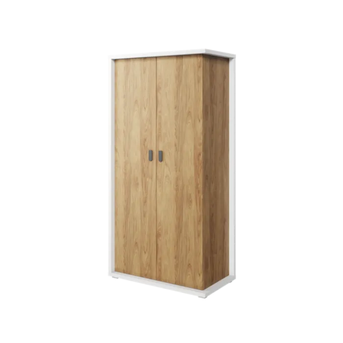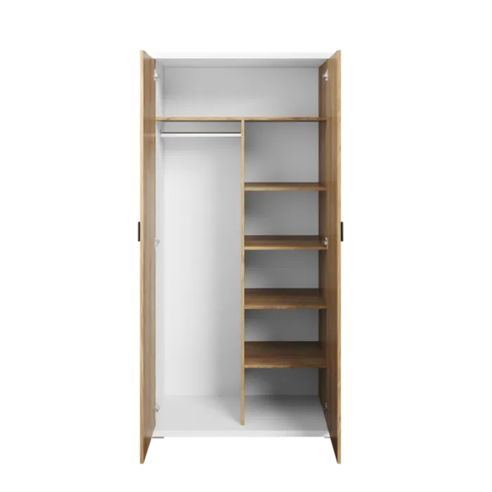 Garderobna omara TRNULJČICA 2 je prostorna dvovratna omara s funkcionalno notranjostjo. Garderobna omara je razdeljena na pol in ustvari prostor za notranjo knjižno omaro s policami in obešalo za oblačila, na katero lahko poljubno obešamo oblačila različnih dolžin. Dodaten prostor za shranjevanje se nahaja na visoki polici nad obešalom za oblačila in na dnu garderobne omare. Stilsko pohištvo na zanimiv način združuje sodobnost s kančkom tradicije. Brezčasna kombinacija bele in dekorja s toplo barvo lesa naredi omaro prijeten aranžma v vsakem interierju. Pozornost pritegne moden, masiven korpus, ki hkrati postavlja okvir pohištva. Izdelana je iz trpežne laminirane plošče, zaključeno s trpežnim ABS robom.