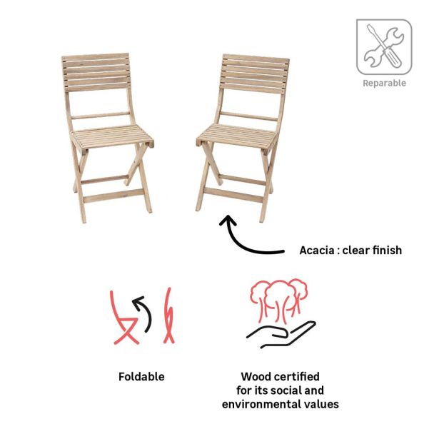 Izdelani iz FSC acacije iz gozdov, katerih upravljanje je priznano kot odgovorno in trajnostno, so ti stoli zasnovani za dolgotrajno uporabo. Da ohranite svoj stol, priporočamo, da ga hranite v zaprtih prostorih v času, ko ga ne uporabljate, ter da les enkrat ali dvakrat letno negujete s teak ali lanenim oljem. So popravljivi, nadomestni deli so na voljo za podaljšanje življenjske dobe vašega pohištva.