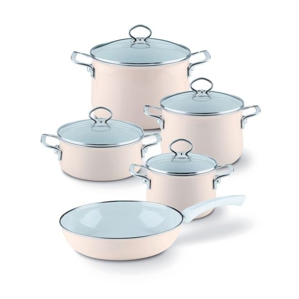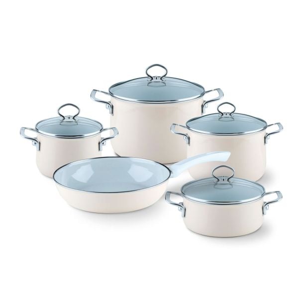 Garnitura vsebuje lonce premera 16, 20 in 24 cm, kozico premera 20 in ponev 28 cm. Specialna emajlirana posoda z ekstra ojačanim dnom, ki garantira hitro segrevanje hrane. Emajlirana posoda predstavlja zdravo kuhanje in izpolnjuje vse sodobne zahteve, kot so varčevanje z energijo, skrb za ekologijo. Emajl pomeni zdrav način kuhanja, odporen je proti vrezninam in praskam, ne vpliva na okus in deluje antibakterijsko. Posoda je odporna na visoke temprature in primerna za pranje v pomivalnem stroju.
