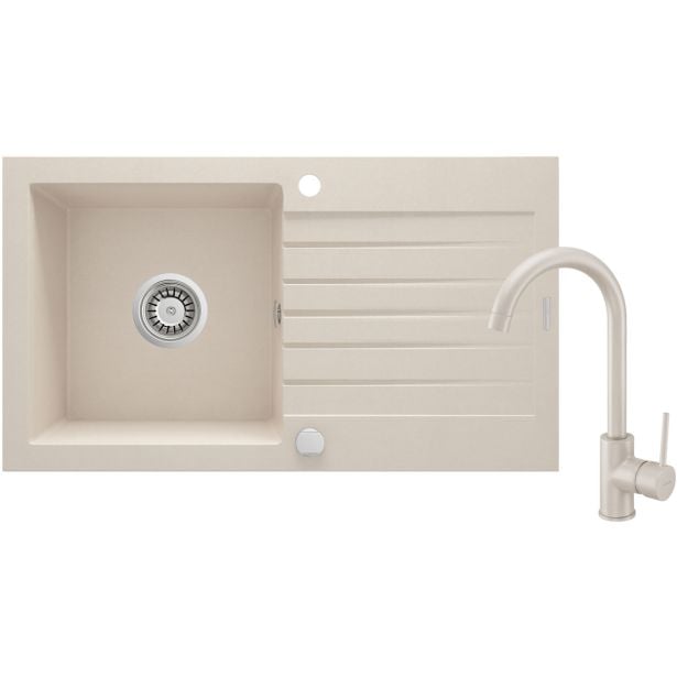 Set granitnega korita in armature v bež barvi zaradi atraktivnega izgleda prinese eleganco v vsako kuhinjo.
