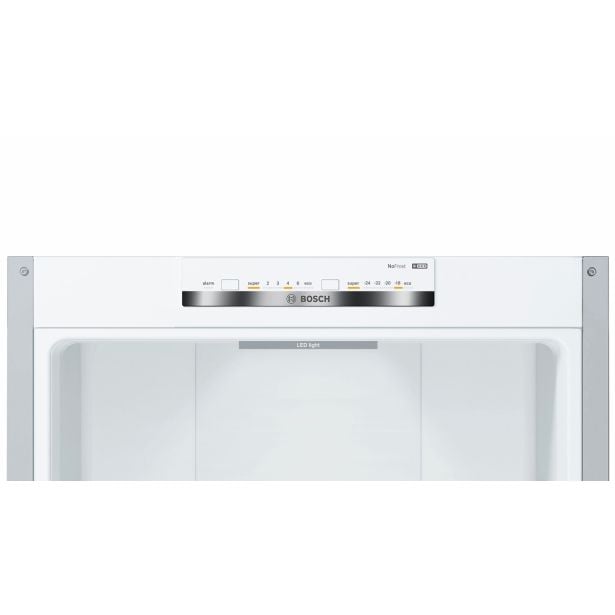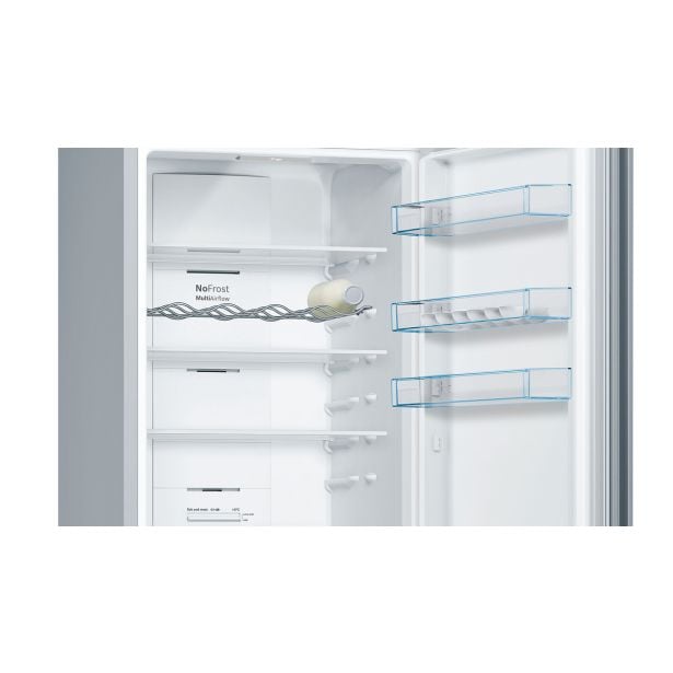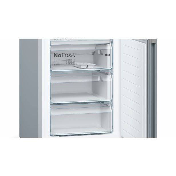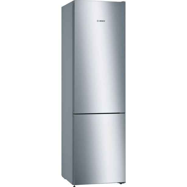 Prostostoječi hladilnik z zamrzovalnikom Bosch KGN39VLEB nudi 237 l hladilnega in 89 l zamrzovalnega prostora. S funkcijo No Frost preprečuje nabiranje ledu, ohranja živila sveža in omogoča pregledno shranjevanje. Eleganten inox dizajn se lepo poda v vsako kuhinjo.