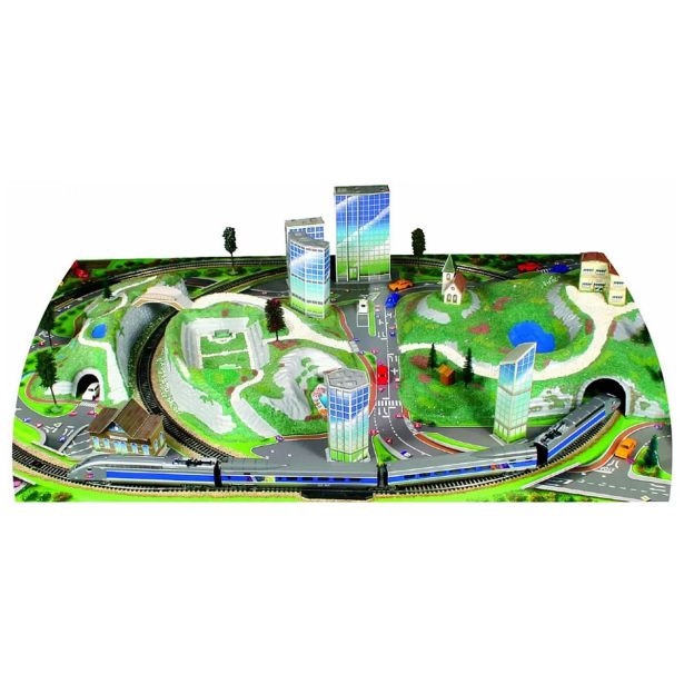 Set vsebuje lokomotivo s pogonom, lokomotivo brez pogona, dva potniška vagona, reliefna maketa s predorom in zgradbami ter 2,9 metrov tirnih elementov.