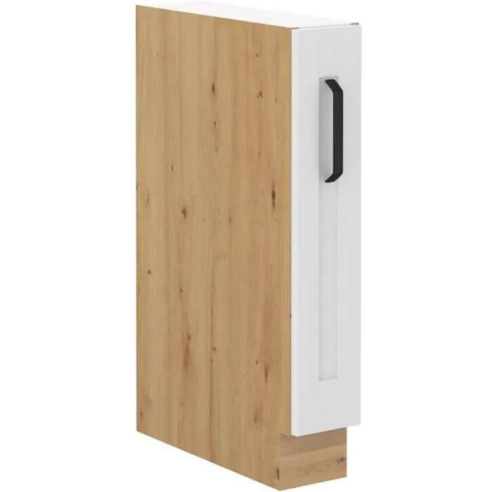 Izvlečna omara VANESA 15D je sestavljena iz MDF plošče, debeline 16 mm, robovi so iz ABS 1 mm, ročaji pa so iz kovine v črni barvi. Korpus je narejen iz laminirane plošče, debeline 16 mm, robovi so iz melamina. Kuhinjski element je na voljo v beli / hrast barvi in ima mehko zapiranje.