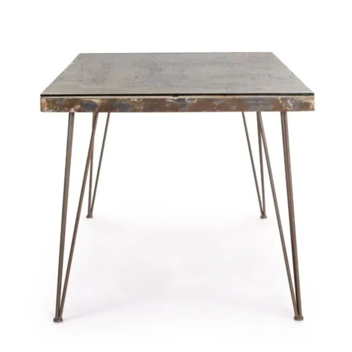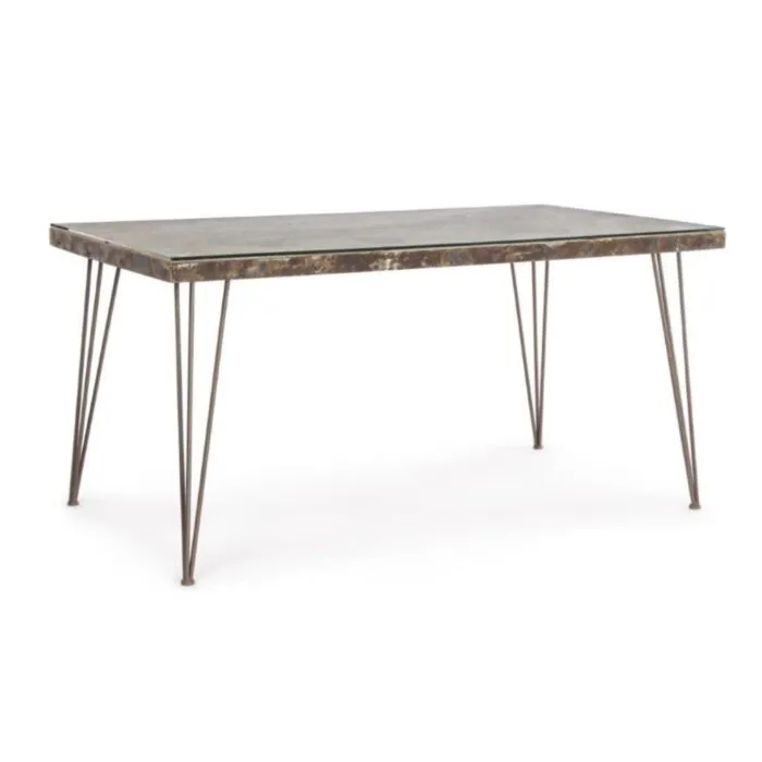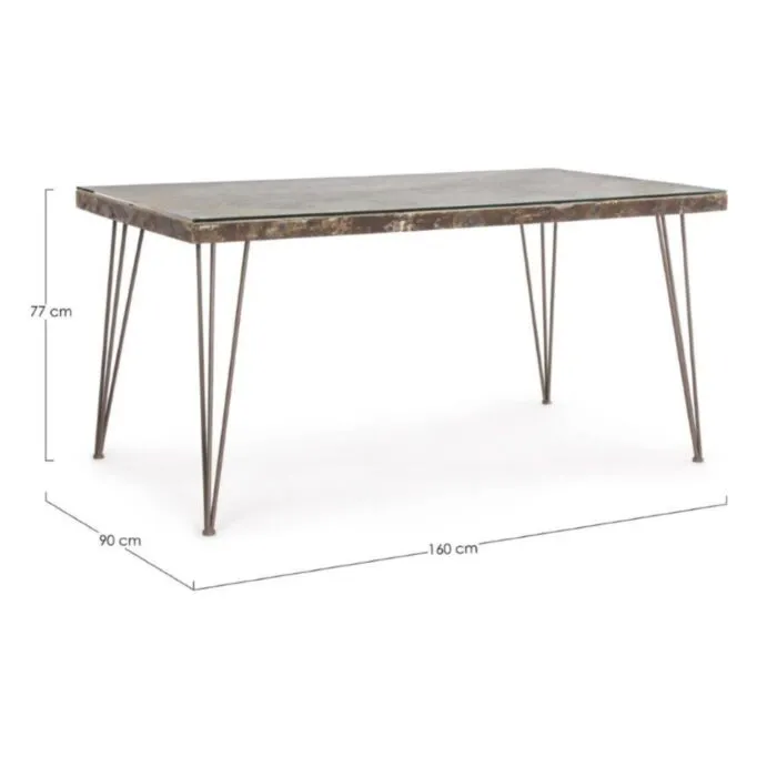 Jedilna miza ATLANTIDE je sestavljena iz kovinskega okvirja starinskega izgleda, mizna plošča je iz MDF-ja in stekla.