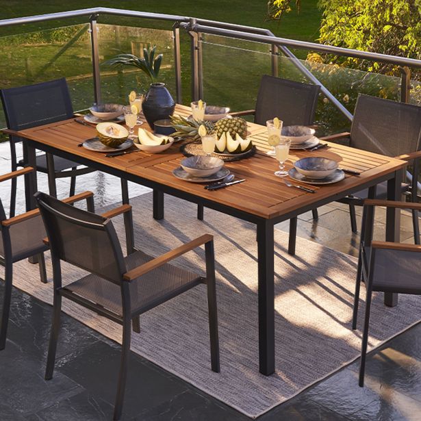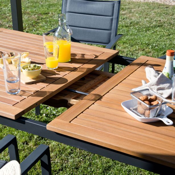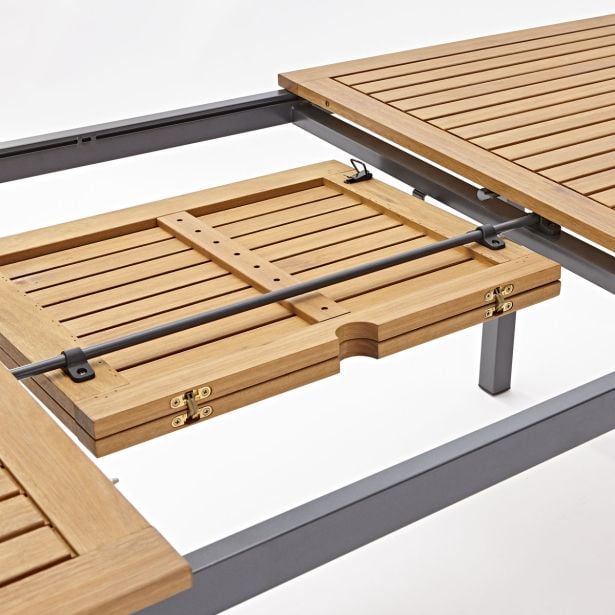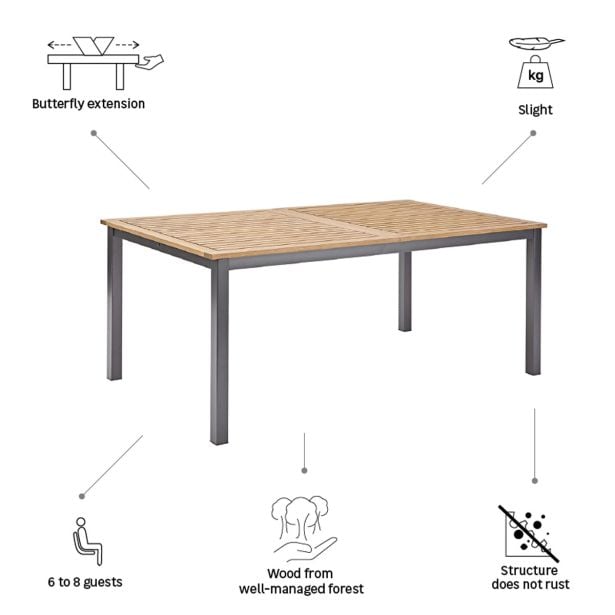 Miza Oris je idealna za udobno namestitev 6 oseb. Njena pravokotna mizna plošča skriva podaljšek metuljaste oblike, ki vam omogoči, da enostavno dodate še 2 sedeža. Ko je podaljšek odprt, omogoča enostavno postavitev senčnika v sredino mize, kar vas ščiti pred soncem, ne da bi oviral prostor. Mizna plošča je narejena iz eukaliptusovega lesa, okolju prijaznega, družbeno koristnega in ekonomsko trajnostnega, kar ga naredi trpežnega in odpornega na vremenske spremembe. Struktura mize je izdelana iz aluminija, ki je zelo odporen na vlago in rjo. Miza je lahka in jo lahko enostavno premikate glede na svoje želje.