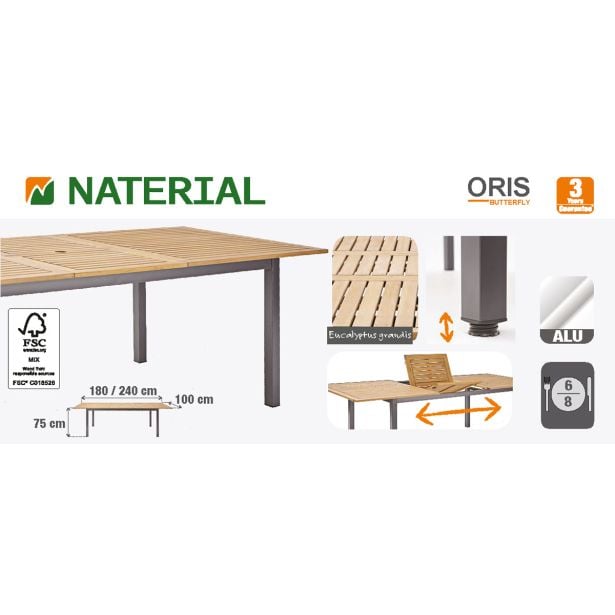 JEDILNA MIZA ORIS METULJ ALU + EVKALIPTUS 180/240Mizna plošča velikosti 180 x 100 cm skriva 60 cm dolg podaljšek v obliki metulja. Izdelana je iz evkaliptusovega lesa s certifikatom FSC. Konstrukcija je izdelana iz aluminija, zato je miza lahka in odporna proti rji.