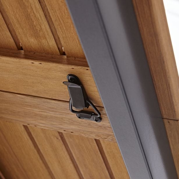 Miza Oris prinaša naraven in sodoben videz. Zlata barva lesa se lepo ujema z antracitno barvo okvirja. Z enakimi stoli iz iste serije lahko ustvarite harmonično naravno vzdušje za vaše zunanje obroke.