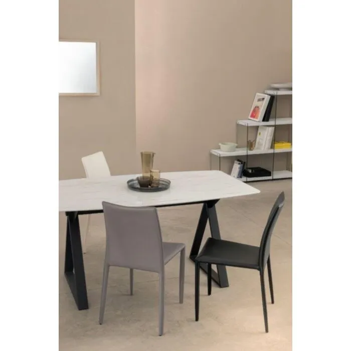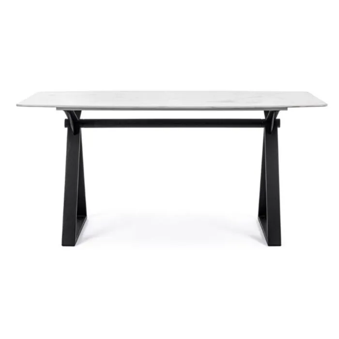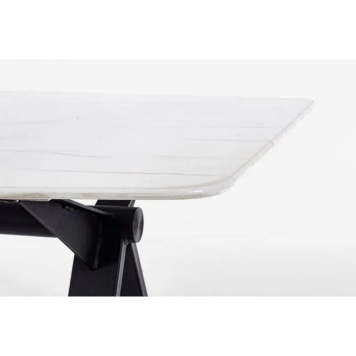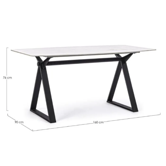 Jedilna miza PALOMA 160X90 ima jeklene noge v črni barvi. Mizna plošča je izdelana iz kaljenega stekla debeline 10mm, ki je oblečena v oblogo z učinkom marmorja v beli barvi.