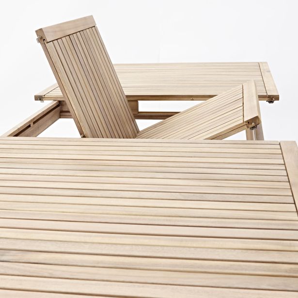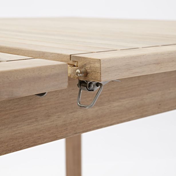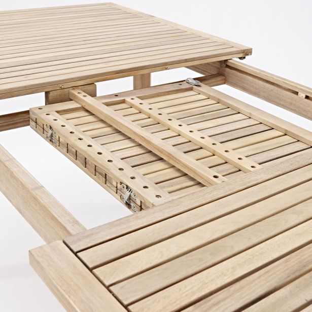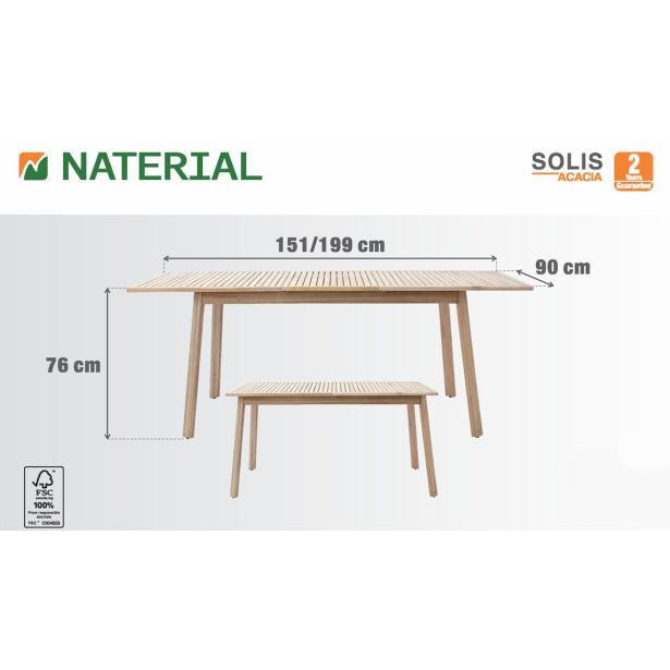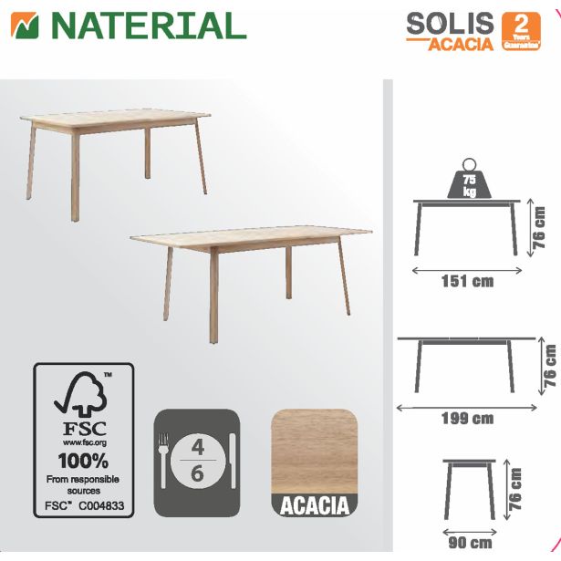 Miza Solis, ki običajno gosti 4 osebe, skriva priročno presenečenje ? metuljasto podaljšavo, s katero udobno sprejmete do 6 gostov. Elegantna in izdelana iz naravnega akacijevega lesa je izjemno odporna in trajna. Akacija s svojo visoko gostoto zagotavlja odpornost proti vremenskim vplivom. Ta plemeniti les, ki spominja na surovi teak, zagotavlja dolgotrajnost vašega pohištva skozi vse sezone. Površina mize je sestavljena iz dveh vrst tankih letvic z gladkim okvirjem, ki ohranja naravni videz lesa in preprečuje nabiranje drobnih delcev.