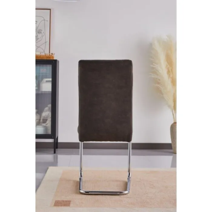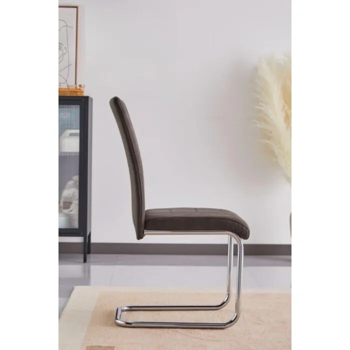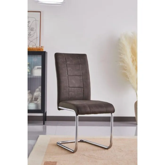 Jedilni stol DANA 2 je elegantne oblike in kakovostne izdelave. Njegov dizajn se bo podal v vsako jedilnico. Oblazinjen je v sivem blagu, ki na videz spominja na umetno usnje. Stol ima močno kromirano podnožje.