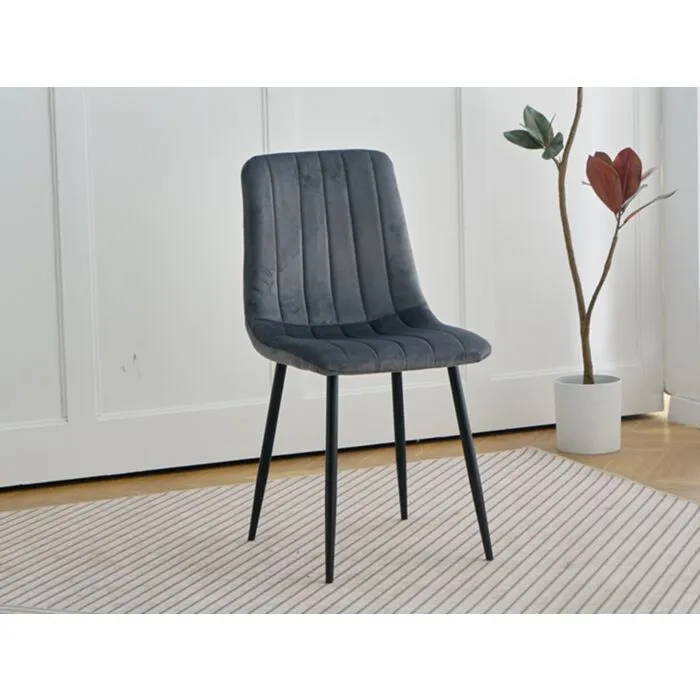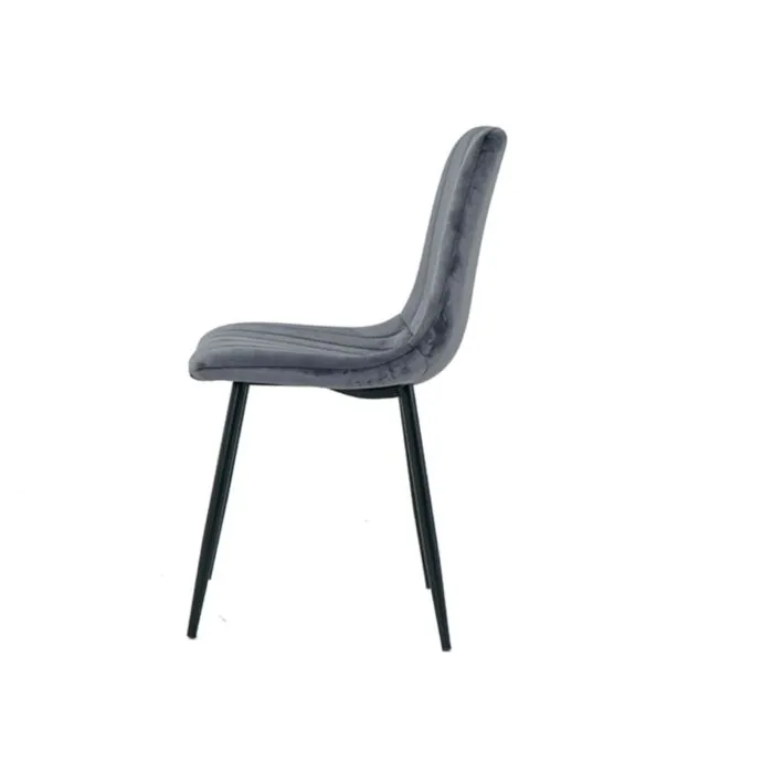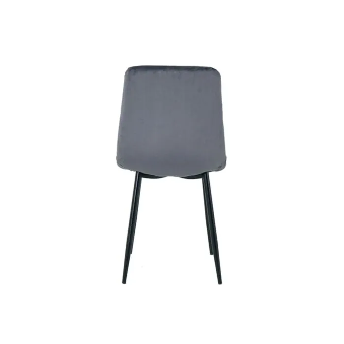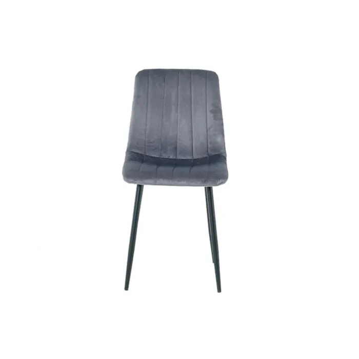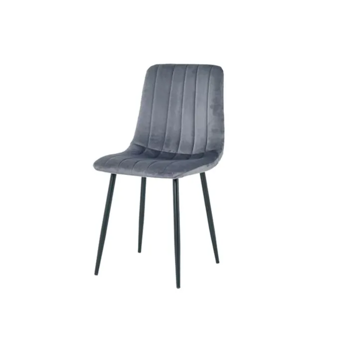 Jedilni stol FOXY velvet siva je odlična rešitev za kombiniranje v minimalističen ali industrijski stil prostora. Kombinacija sivega prešitega blaga s črnimi kovinskimi nogami ustvari eleganco in lahkotnost. Noge so prašno barvane s debelino profila 1,2 mm. Profiliran naslon omogoča optimalen položaj sedenja ter udobje. Raven vzorec šiva na tkanini pa okrepi tkanino oblazinjenja in ustvari dodatno eleganco.
