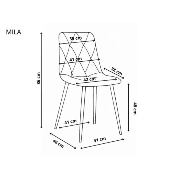 Jedilni stol MILA velvet bež je odlična rešitev za kombiniranje v minimalističen ali industrijski stil prostora. Kombinacija sivega prešitega blaga s črnimi kovinskimi nogami ustvari eleganco in lahkotnost. Noge so prašno barvane s debelino profila 1,2 mm. Profiliran naslon omogoča optimalen položaj sedenja ter udobje. Prešiti vzorec pa okrepi tkanino oblazinjenja in ustvari dodatno eleganco.