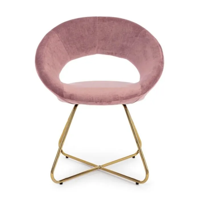 Jedilni stol VANITY v roza barvi, je eleganten in modernega dizajna. Stol je udoben saj je oblazinjen v poliuretansko peno, ki je oblečena v mehko žametno tkanino roza barve. Stolu dajejo prefinjen videz zlate noge, ki so narejene iz kovine, kar zagotavlja stabilnost.