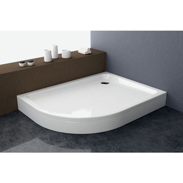 Vgradna tuš kad iz sanitarnega akrila, asimetrične oblike poskrbi za sodoben dizajn. Leva izvedba.