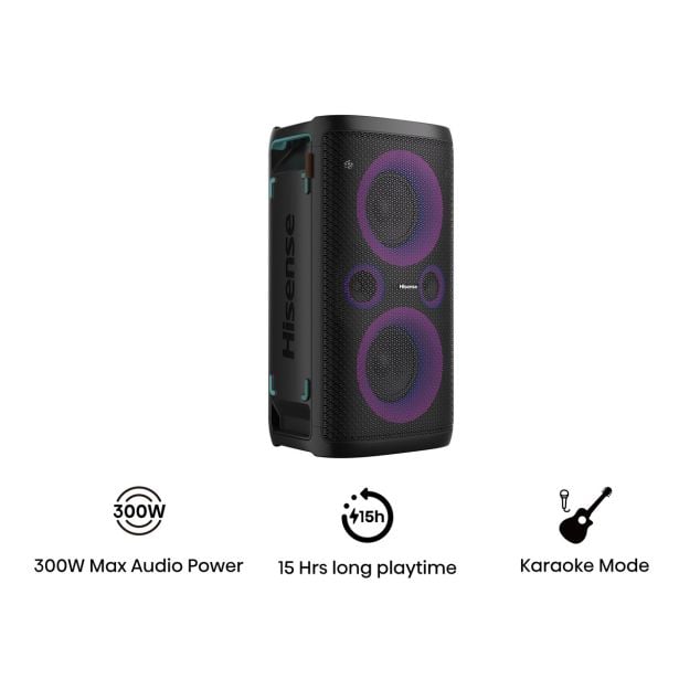 Hisense Party Storm je vsestranski party zvočnik, zasnovan za pravo zabavo kjerkoli ? doma, na prostem ali na poti. S svojo močjo 300?W in bogatim zvokom z globokimi basi ponuja odlično zvočno izkušnjo, ki napolni vsak prostor z energijo.