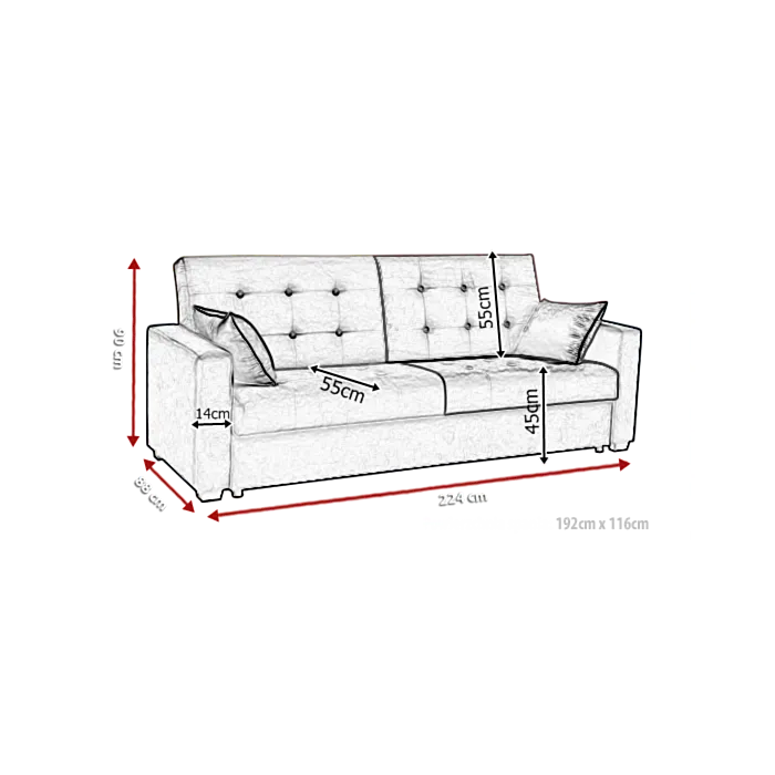 – D: 224 cm x G: 88 cm x V: 90 cm