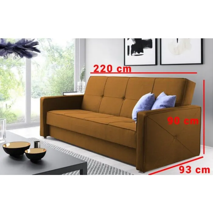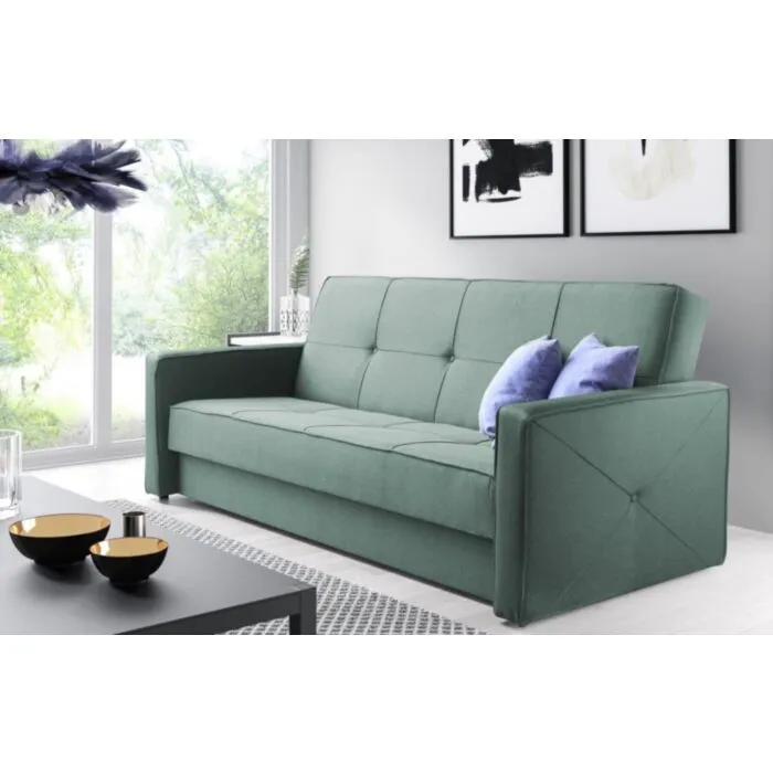 Kavč FABIO je idealen kos pohištva, da popestri prostor. Je odlična garnitura po odlični ceni. Narejen je iz kvalitetnih materialov in kakovostnega blaga. Kavč je vzmeten z vzmetmi tipa Bonell. Raztegne se v udobno ležišče in ima zaboj za shranjevanje posteljnine. Na voljo je v več barvah. Zraven garniture dobite pripadajoče blazine.