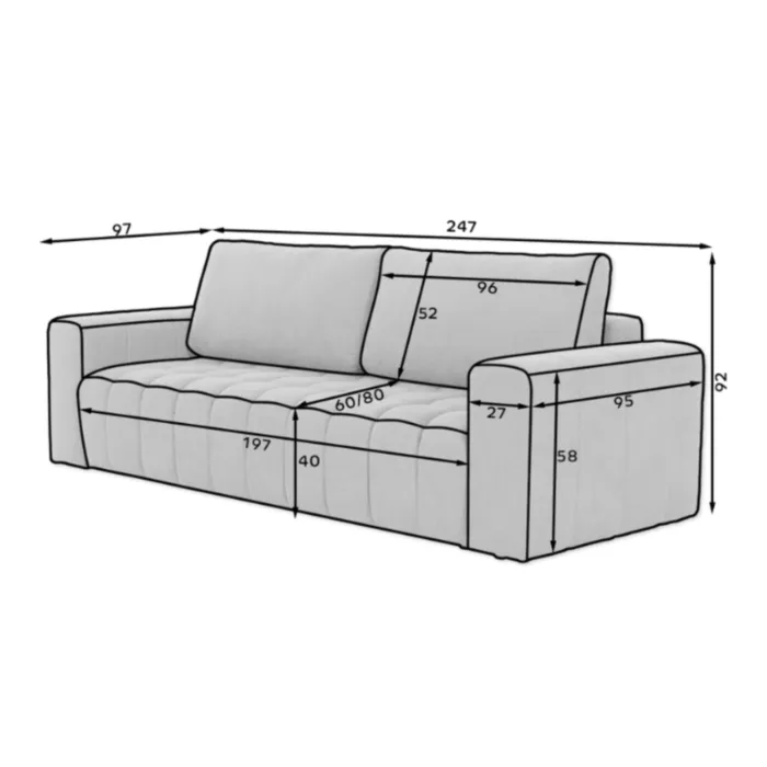 – D: 247 cm x G: 97 cm x V: 92 cm