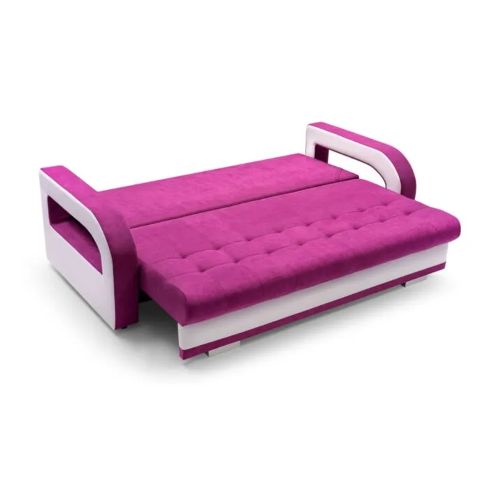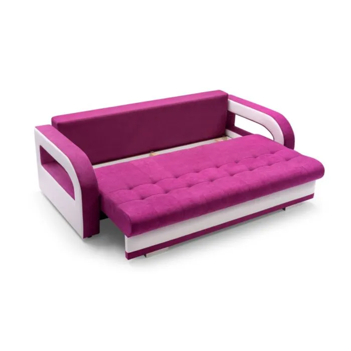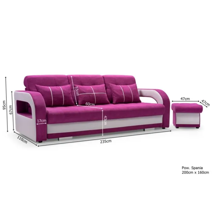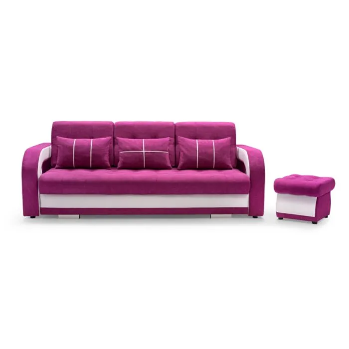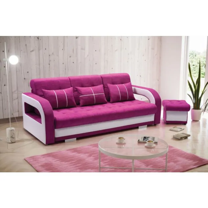 Kavč MILLY je živahen in sodoben kavč, primeren za dnevni prostor ali otroško sobo. Narejen je iz kvalitetnega blaga. Pri raztegnitvi vam pomaga mehanizem. Kavč ima predal za spravljanje posteljnine. Ob nakupu dobite še en tabure in tri okrasne blazine.