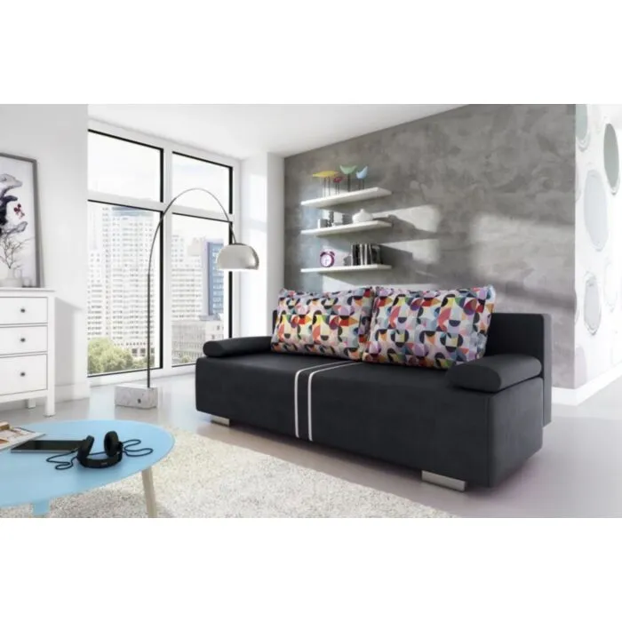 Kavč POLLY je živahen in sodoben kavč, primeren za dnevni prostor ali otroško sobo. Narejen je iz kvalitetnega blaga. Pri raztegnitvi vam pomaga mehanizem. Spalna površina ima vzmetenje Bonell, ki skrbi za udobno ležanje. Kavč ima predal za spravljanje posteljnine. Ob nakupu dobite okrasne blazine.