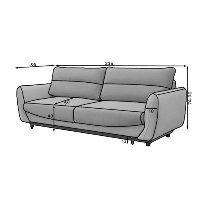 – D: 236 cm x G: 95 cm x V: 90 cm