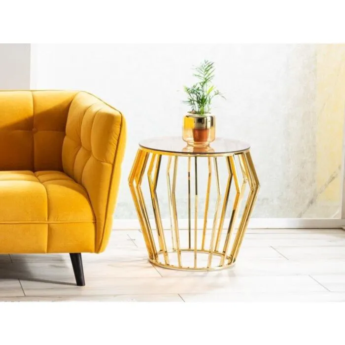 Klubska miza ALINA je modernega dizajna. Mizna plošča je narejena iz jantarnega kaljenega stekla. Mizno podnožje je narejeno iz nerjavečega jekla v barvi zlata.