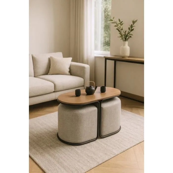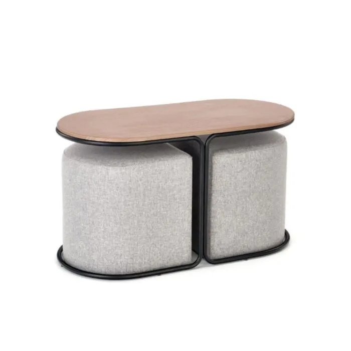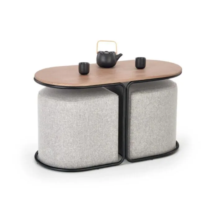 Moderna klubska mizica REKSI z dvemi tabureji, narejen je iz kovine in laminirane mizne plošče, tabureji so iz tkanine.